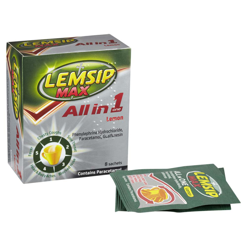 For effective relief of colds and flu symptoms Lemsip Max All in One Cold and Flu Lemon sachets. It is specially formulated to treat help with reducing fever, helps treat headaches and body aches, and helps treat a blocked nose & sore throat.