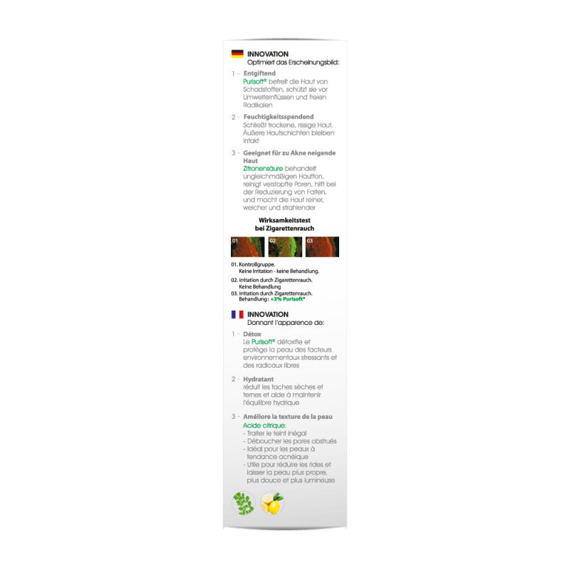 - Detox: Purisoft® detoxifies and defends the skin against environmental stressors and free radicals