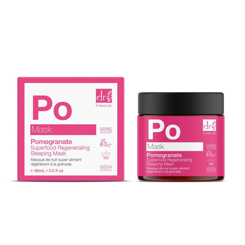Protect your skin's natural oil barrier and protect from UV damage with nutrients using Dr Botanicals Apothecary Pomegranate Superfood Regenerating Sleeping Mask. Formulated with Pomegranate Seed and Coconut Oil, this natural mask will hydrate, nourish and revive your skin. Suitable for vegans.