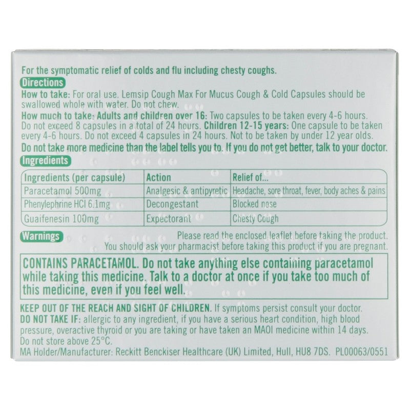 Lemsip Cough Max For Mucus Coughs & Colds Capsules is used for relieving the symptoms of colds and flu, including chesty coughs, blocked nose and sinuses, sinus pain, fever, headache, aches and pains and sore throats. The capsules contain three active ingredients, paracetamol, guaifenesin and phenylephrine hydrochloride. Paracetamol is a simple painkilling medicine used to relieve mild to moderate pain and fever.